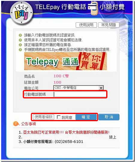 玩家請選擇電信公司,及輸入您的行動電話號碼,之後確認消費產品金額及項目無誤後,請詳閱使用者條款後,然後勾選我同意。按下確定後,開始進行交易流程。