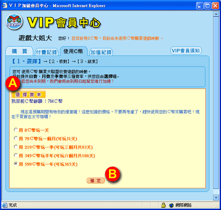 選擇費率:請選擇您要用多少C幣,玩遊戲多久。