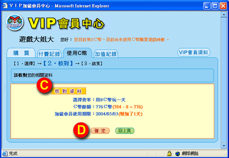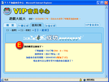 恭喜您成功完成使用C幣,請確認您的購買紀錄是否有誤。