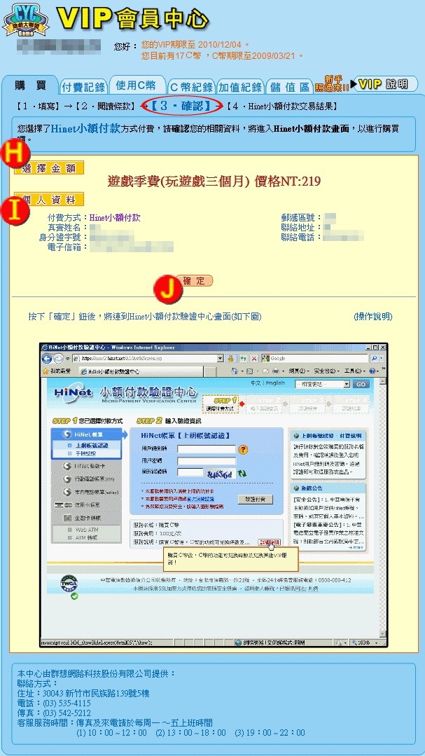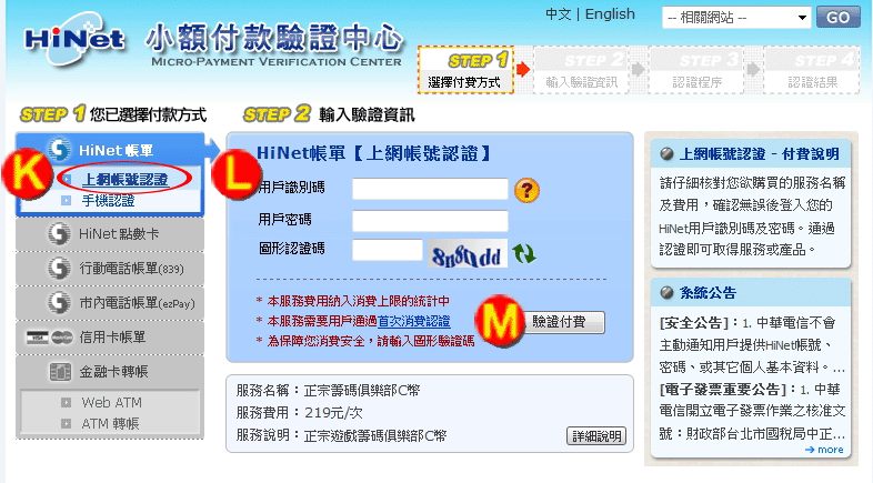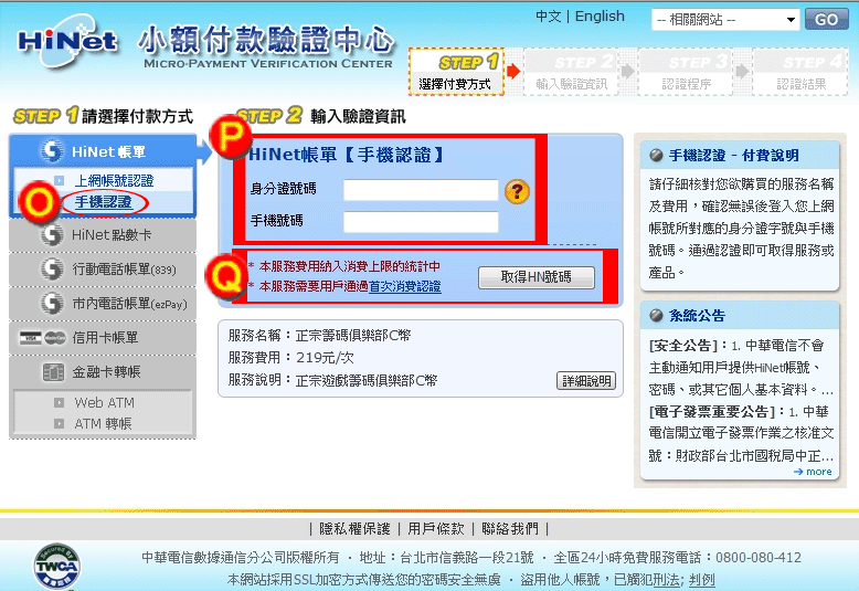 請按「確定」。將進入Hinet小額付款驗證中心畫面。 |