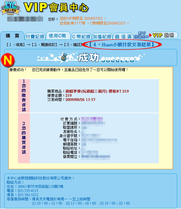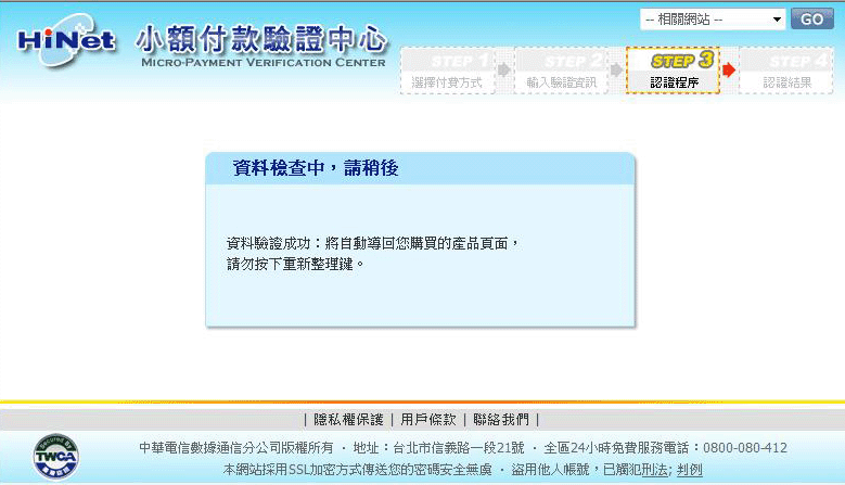 此頁面將通知您的Hinet小額付款購買流程是否成功! |