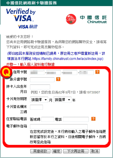 請依項目需求輸入您正確的個人資料,以便信用卡銀行單位進行核對。 |