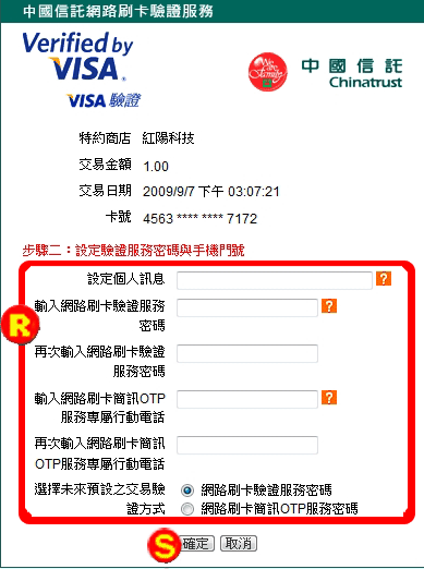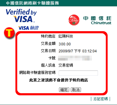 成功連結至您的原發卡銀行之認證畫面。(下圖僅以中國信託之網路刷卡驗證頁面為例,實際畫面以各刷卡銀行提供之頁面為準。) |
