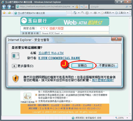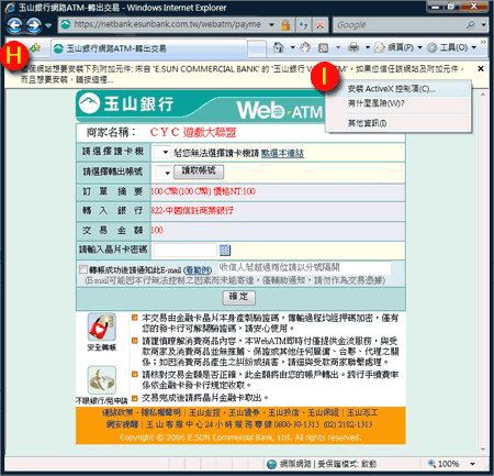 首次使用請先安裝即時付元件,請於上方跳出狀態列按下滑鼠左鍵。 |